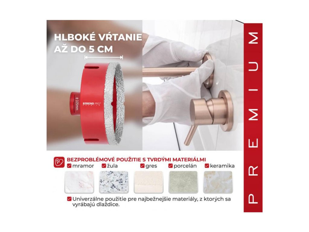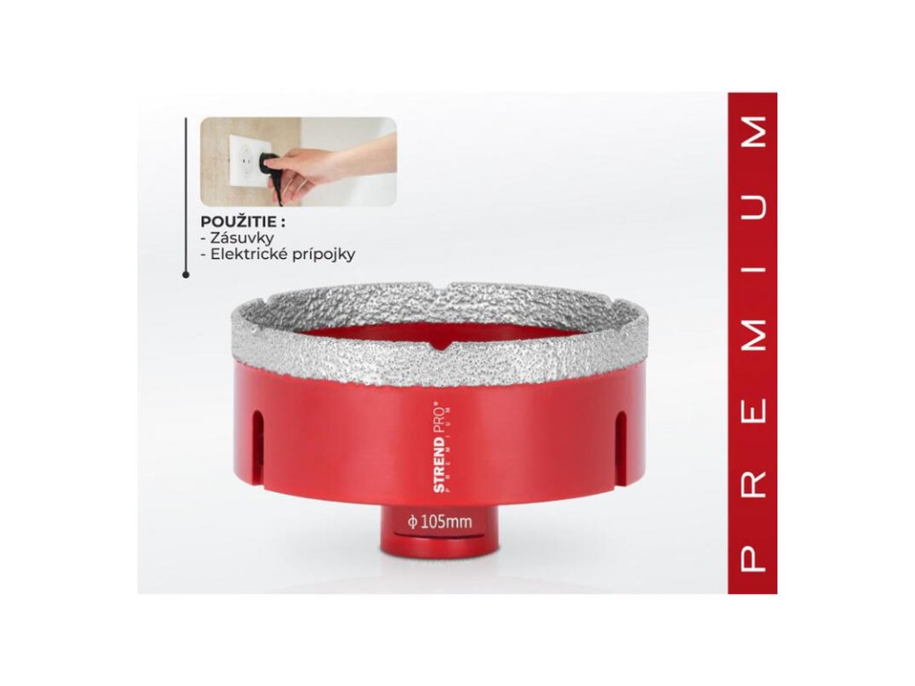 Vyrezávač Strend Pro Premium je vhodný na vyrezávanie všetkých druhov tvrdeného kameňa a jeho zlúčenín, keramických dlaždíc, mramoru, gresu, porcelánu a žuly. Špičkový proces spájania diamantov zabezpečuje vysokú odolnosť voči vysokým teplotám a predlžuje životnosť. Extrémne ľahké rezanie a vysoká výkonnosť pri vykružovaní. Perfektne ho využijete pri montáži kúpeľnovej sanity a príslušenstva, inštalácii káblov, elektrického vedenia, radiátorov atď. Je použiteľný s akoukoľvek vŕtačkou s použitím vhodného adaptéru. Typ upínania: M14, Ø vyrezávača je 105 mm.