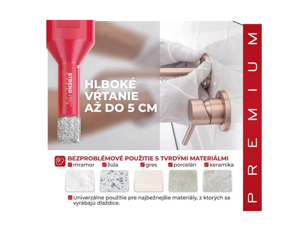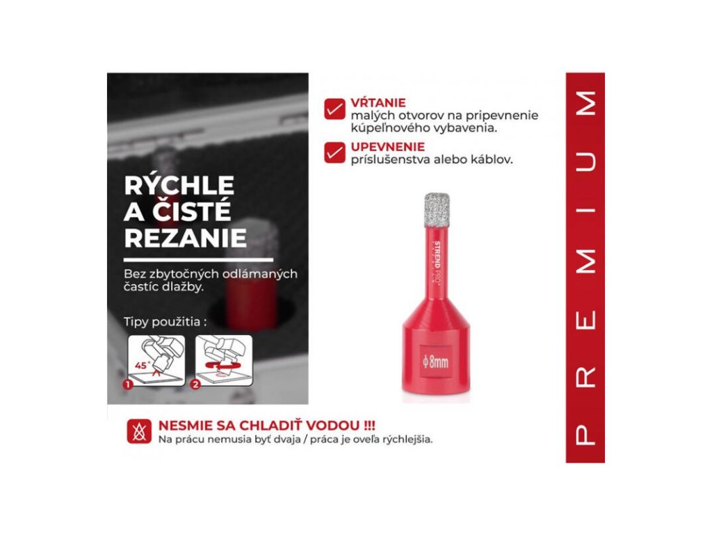 - Vyrezávač Strend Pro Premium je vhodný na vyrezávanie všetkých druhov tvrdeného kameňa a jeho zlúčenín, keramických dlaždíc, mramoru, gresu, porcelánu a žuly.