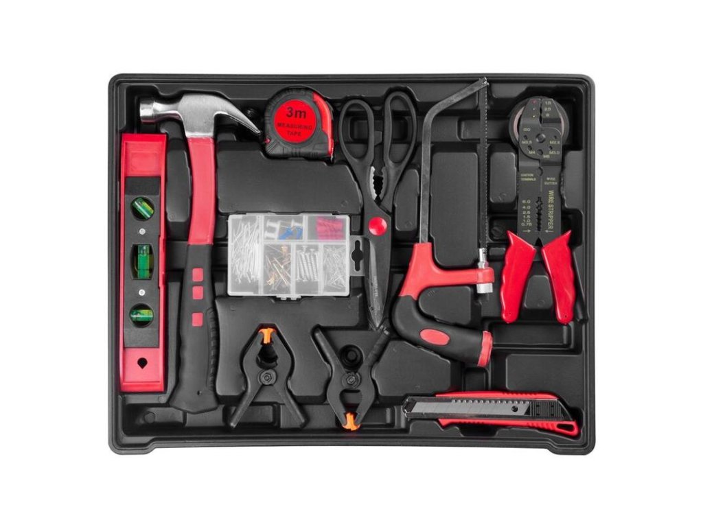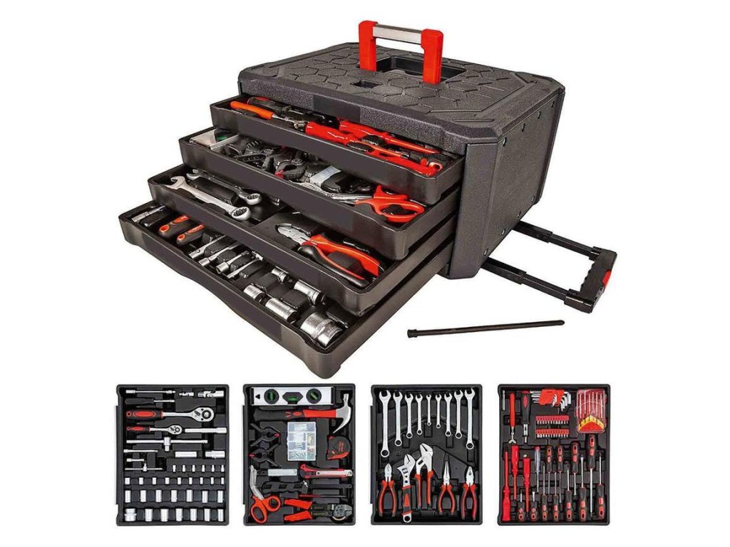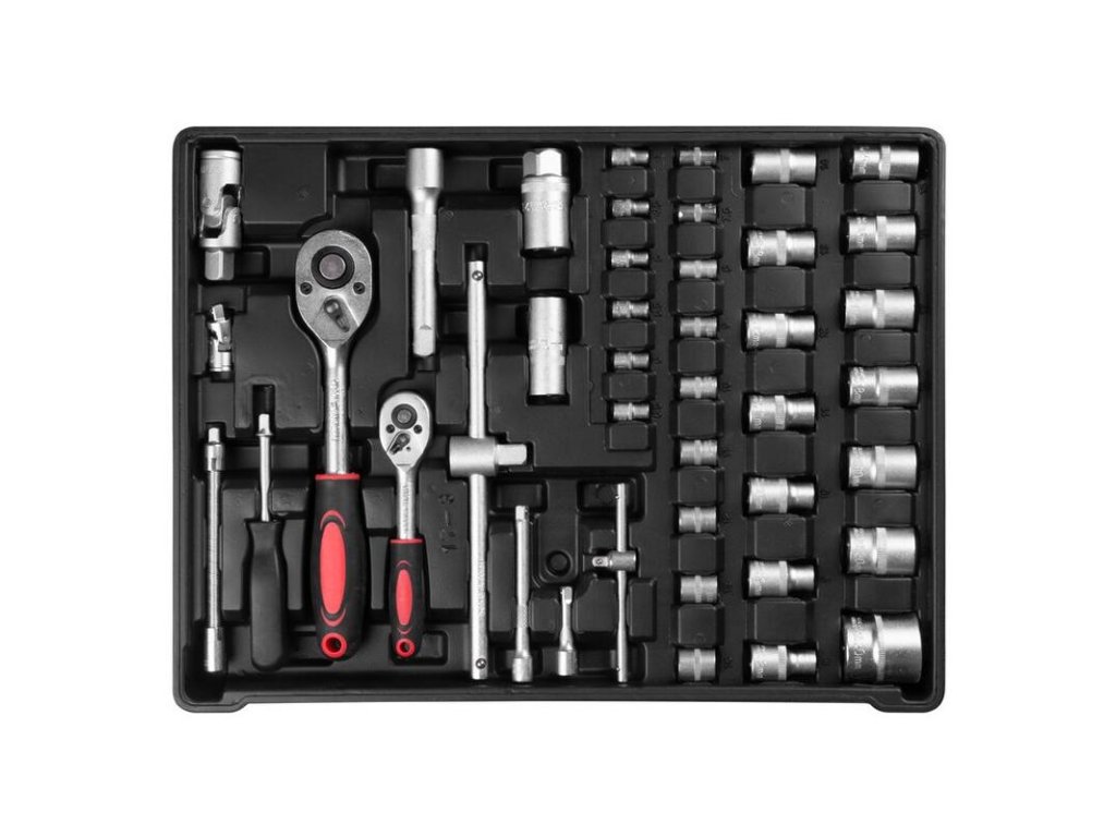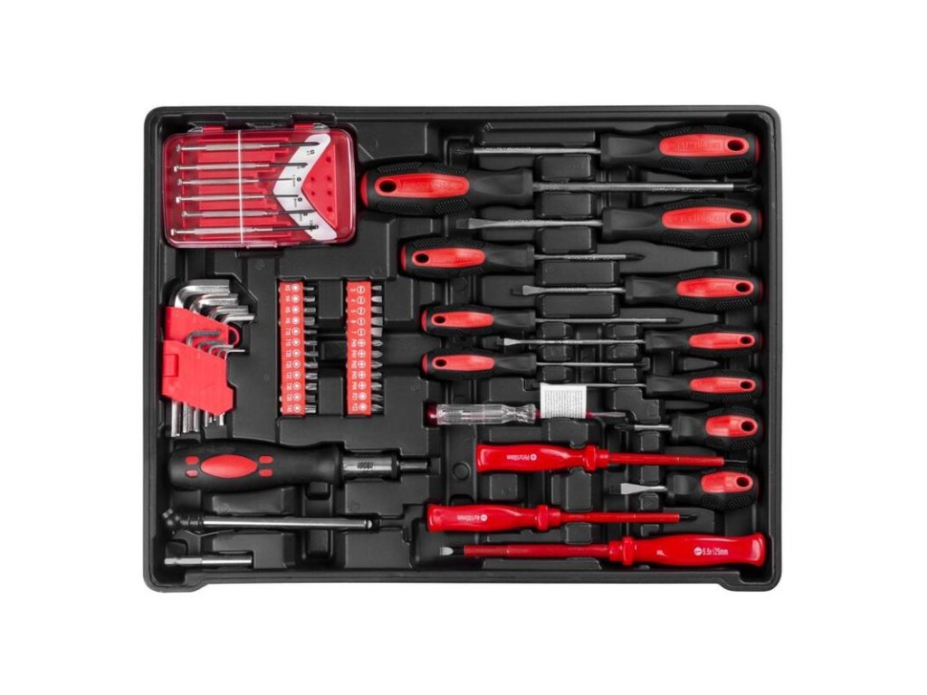 15 ks 1/4" hlavica 4-14 mm • 14 ks 1/2" Hlavica 8-30 mm • 2 ks 1/2" hlavica na sviečky 16,21 mm • 2 ks 1/2", 1/4" Kardaň • 2 ks 1/2", 1/4" vrátidlo • 1 ks 1/2" predlžovací nadstavec • 2 ks 1/4" predlžovací nadstavec • 1 ks pružný nadstavec • 2 ks 1/2", 1/4" račňa • 1 ks 1/4" Nadstavec na hlavice 150 mm • 6 ks mikro skrutkovac (s/d 1.0, 1.4, 1.8, 2,4 mm; # 0, 1) • 9 ks imbusový kľuč 1.5-10 mm • 24 ks bit • 1 ks skrutkovač na bity • 1 ks držiak bitov • 14 ks skrutkovač: (-) 3 x 75, 4 x 100, 5 x 75, 6 x 38, 6 x 100 mm (+) 3 x 75, 4 x 100, 5 x 75, 6 x 38, 6 x 100, 8 x 150 mm