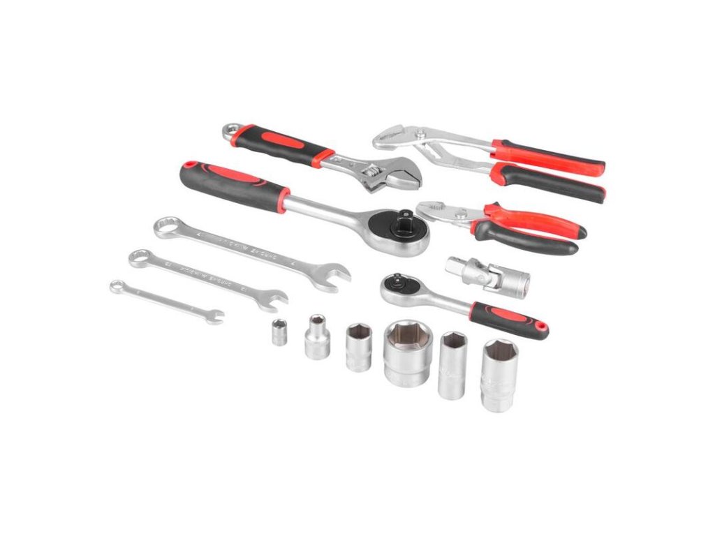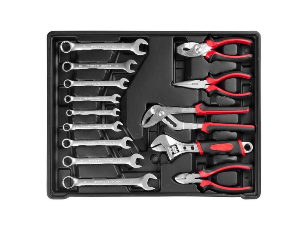 1 ks kliešte na poistné krúžky 150 mm • 1 ks kombinované kliešte 150 mm • 9 ks očkoplochý klúč 8-17 mm •