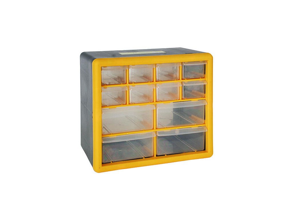 - Zabezpečuje praktické a prehľadné uskladnenie skrutiek, matíc, podložiek a podobného materiálu vďaka 12-tim zásuvkám.