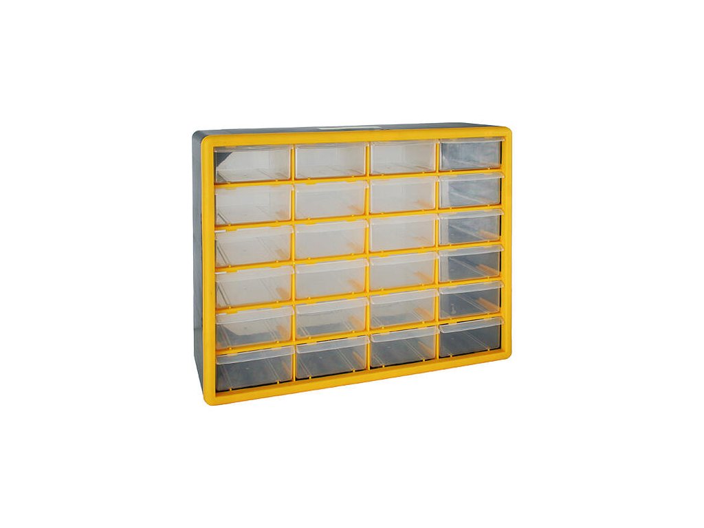 - Zabezpečuje praktické a prehľadné uskladnenie skrutiek, matíc, podložiek a podobného materiálu vďaka 24 zásuvkám.