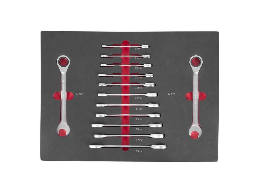 Výplň zásuvky obsahuje 13 kusov očko-vidlicových kľúčov od 8 - 22 mm.