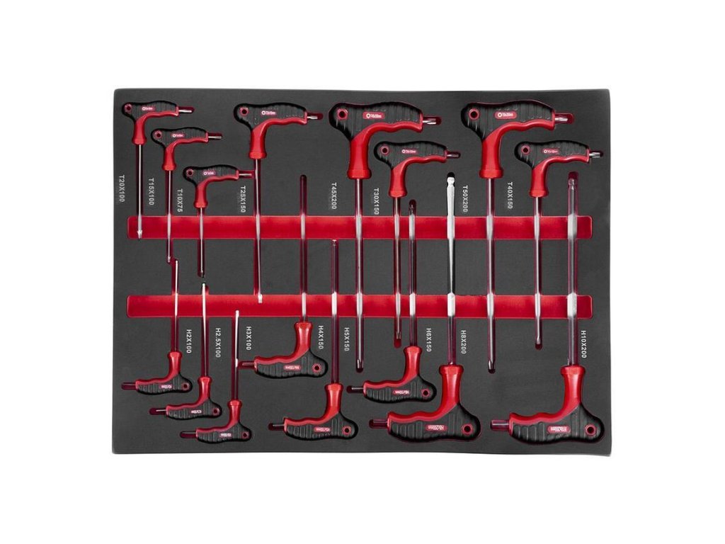 Výplň zásuvky obsahuje 16 kusov T-skrutkovačov : 8x HEX kľúč s guličkou 2x100, 2,5x100, 3x100, 4x150, 5x150, 6x150, 8x200, 10x200 mm a 8x skrutkovač torx T10x75, T15x100, T20x100, T25x150, T30x150, T40x150, T45x200, T50x200 mm.