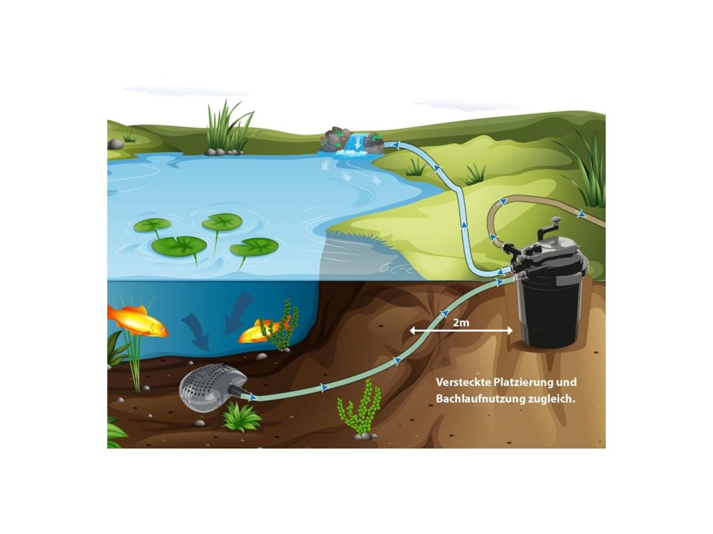 Dá sa z 80 % zakopať a tak skryť. Vytláča vodu až do výšky 1,5 m. Možno ho použiť na napájanie potoka alebo vodopádu. Priezor na kontrolu funkčnosti UV lampy. Indikátor potreby čistenia. Systém spätného preplachovania s rýchlym čistiacim mechanizmom s kľukou. Nie je potrebné otvárať filtračný systém a nečistoty sa vypúšťajú cez bočný vývod filtra.