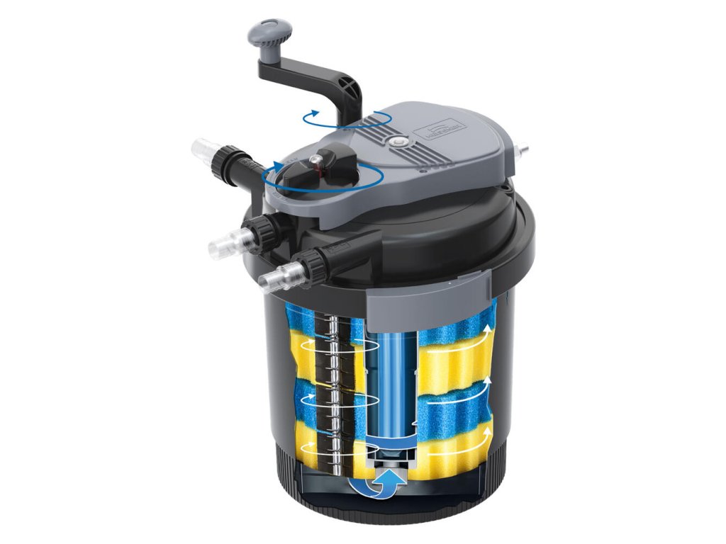 Tlaková filtračná súprava je určená pre jazierka do 10 m³ bez rýb, 5 m³ s rybami, 2,5 m³ s koi kaprami. Čerpadlo stačí umiestniť do jazierka a pripojiť ho k filtru pomocou hadice. Filter má integrovanú UV lampu proti riasam, voda prechádza cez filtračné médiá a je mechanicky a biologicky upravovaná. Filter má tri hadicové prípojky, na vstup, výstup a čistenie. Je možné napájať potok alebo vodopád až do výšky 1,5 m.