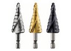 Stupňovité vrtáky (stromčekové vrtáky): Pre vŕtanie otvorov rôznych priemerov do plechu a tenkých materiálov v jednom kroku.