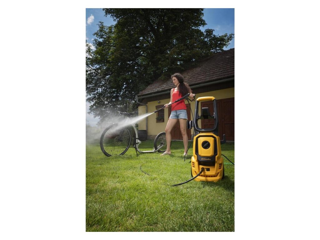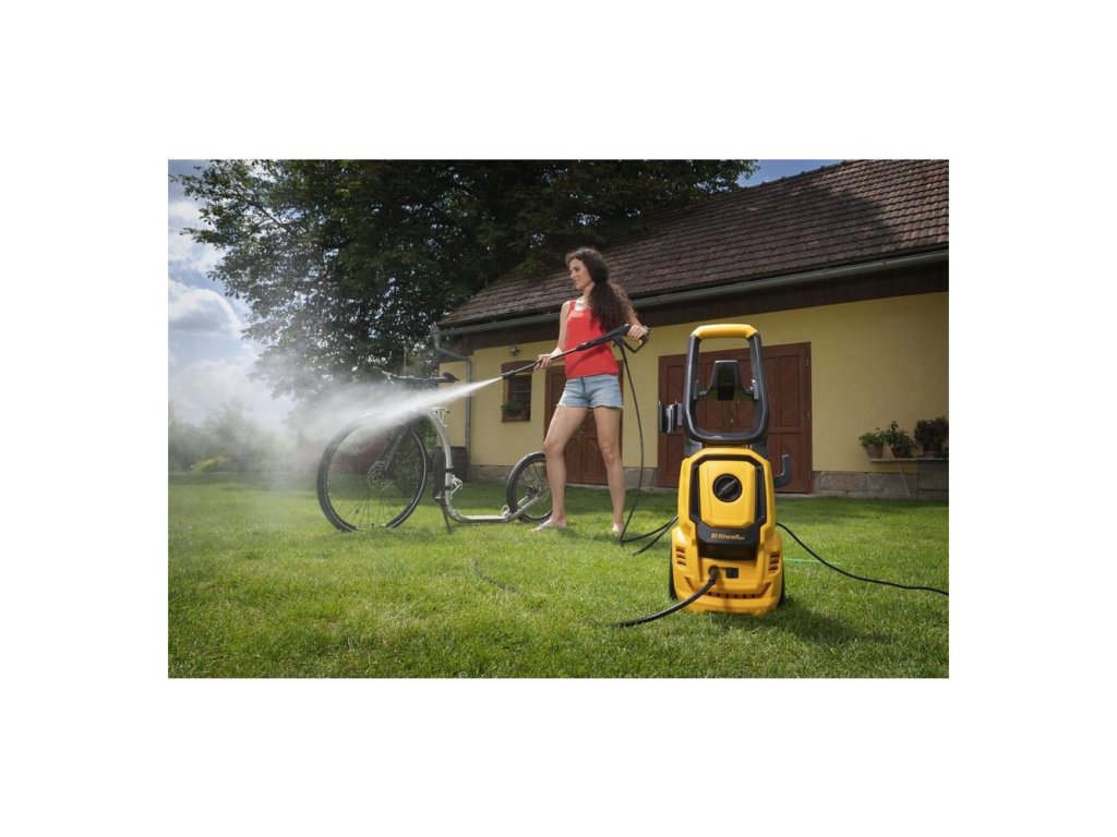 Vybavenie: tlaková pištoľ s rýchlospojkou, nástavec s otočnou nastaviteľnou tryskou, nástavec s otočnou turbo tryskou, 5 m tlaková hadica, 5 m elektrický kábel, priehľadný vodný filter, čistič trysiek, 0,4 l nádrž na čistiaci prostriedok s tryskou, čerpadlo so samonasávacou funkciou, pojazdové kolieska