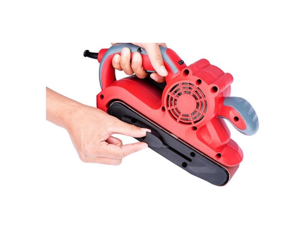 Hlavnú úlohu pri brúsení zohráva okrem motora, brúsiaci pás. Jeho rozmery sú 76 x 533 mm. Pás jednoducho priložíte na potrebný materiál a brúsite. Po opotrebovaní brúsneho papiera je potreba vymeniť ho za vhodný typ. Vďaka jednoduchému mechanizmu nebudete mať problém s rýchlou výmenou brúsneho pásu. Oceníte tiež praktický gombík, ktorý slúži na vycentrovanie brúsneho pásu.