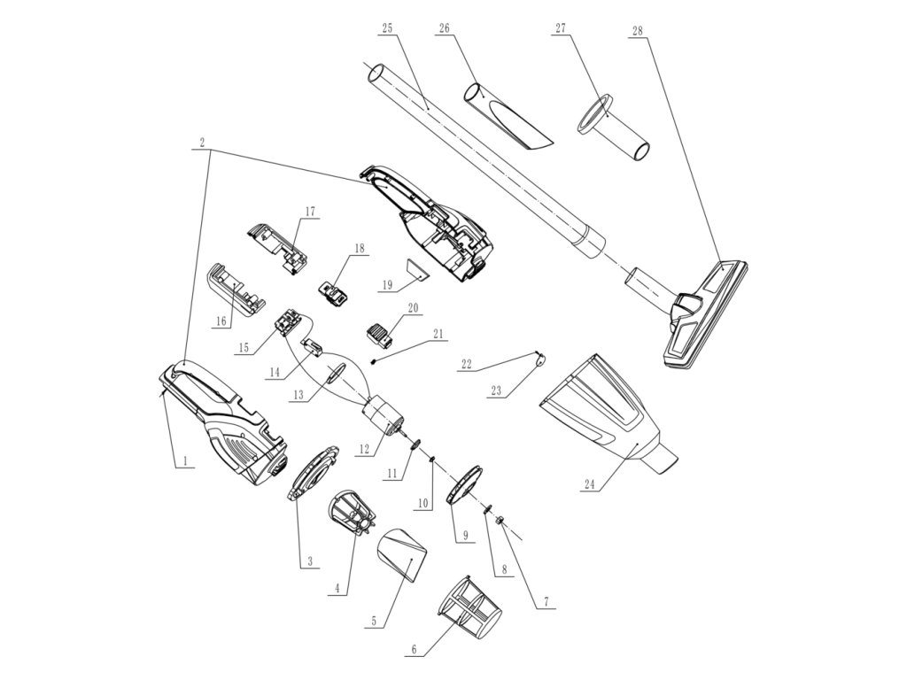 Súčasťou balenia sú 3 druhy príslušenstva (kefa, podlahová hlavica, štrbinová hlavica) a nasávacia trubica. Všetky 3 druhy príslušenstva je možné k akumulátorovému prenosnému vysávaču namontovať priamo alebo je možné najprv namontovať nasávaciu trubicu a následne príslušenstvo, v závislosti od vykonávanej činnosti.