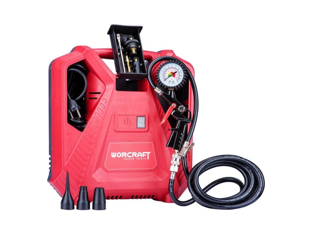 Bezolejový kufríkový kompresor WORCRAFT PAC11-180 je ideálnym pomocníkom do dielne či na cesty. Vďaka veľkému množstvu rôznych koncoviek si hravo poradí s fúkaním pneumatík motocyklov, bicyklov, áut, terénnych štvorkoliek, lôpt, matracov, nafukovacích člnov, raftov a pod. Výhodou je aj silný motor, ktorý má príkon 1,1kW a vysoký pracovný tlak, nastaviteľný až do 8 bar.