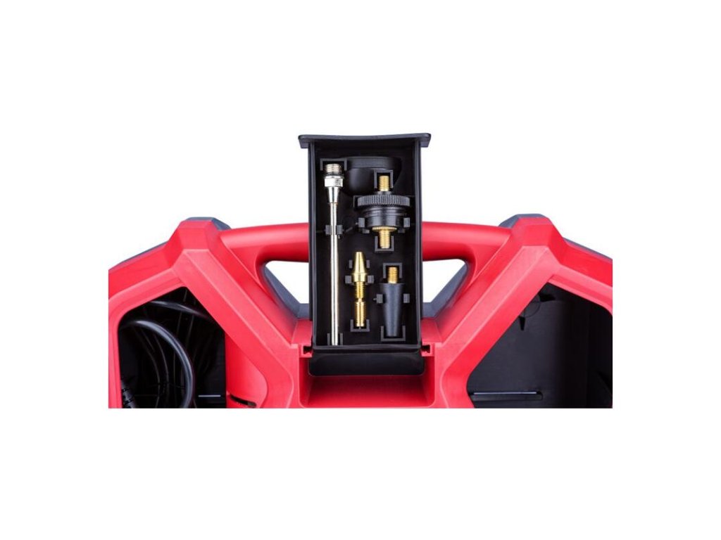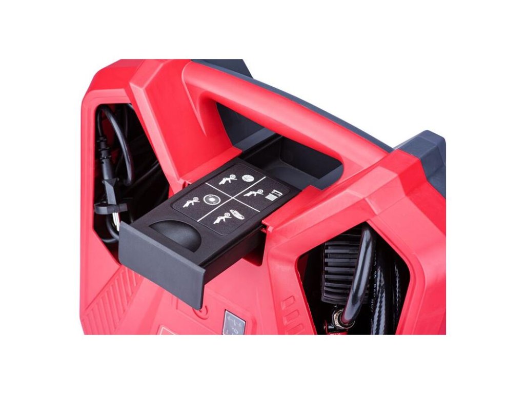 Všetko príslušenstvo, vrátane elektrického kábla, kvalitnej 3 m tlakovej hadice, pištole s manometrom a rôznych koncoviek je šikovne ukryté vnútri kompresora, takže sa Vám nič nestratí. Pohodlné madlo Vám uľahčí prenášanie. Kompresor je vybavený najmodernejším motorom s bezolejovou technológiou. Kontrola oleja, jeho dopĺňanie alebo výmena tak vôbec nie sú potrebné a kompresor je tak vždy pripravený odviesť svoju prácu.