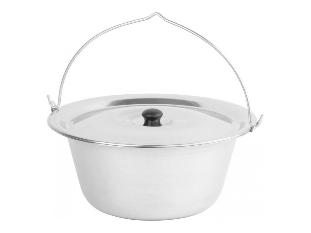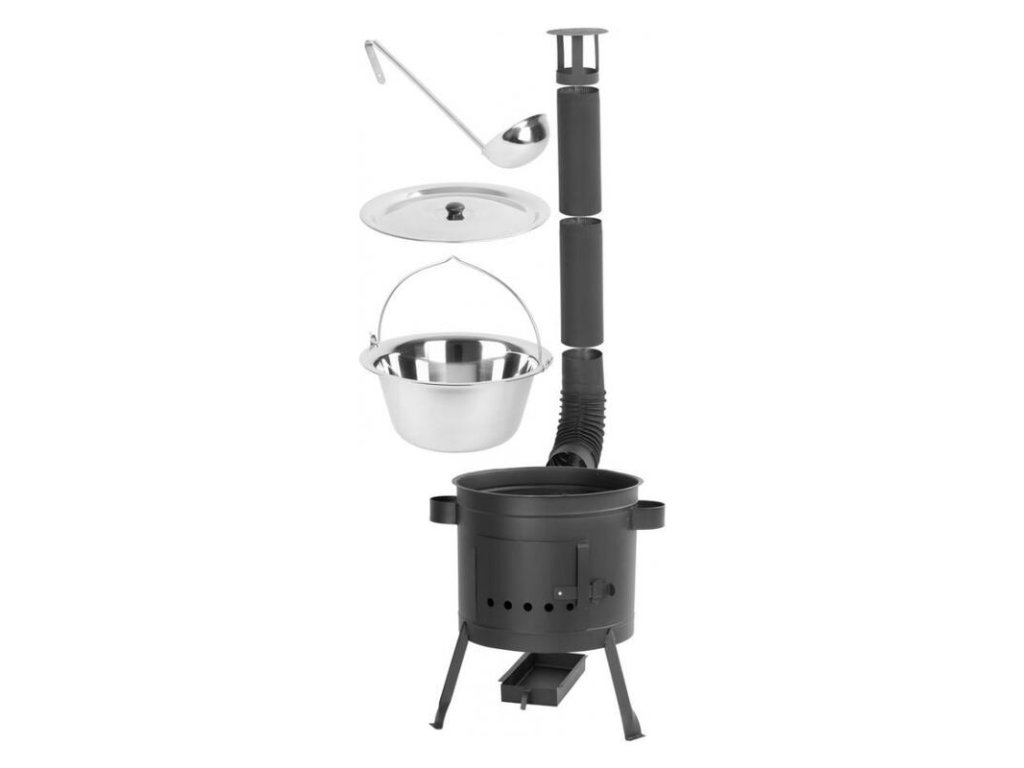 Obsah: - 1 ks železná Párty kotlina (priemer 36cm, výška 42cm) - 1 ks železná strieška - 2 ks železný dymovod - 1 ks železné koleno - 1 ks smaltovaný kotlík 12 litrový - 1 ks nerezová pokrievka - 1 ks nerezová naberacka 250ml s drevenou rúčkou (39*14 cm).