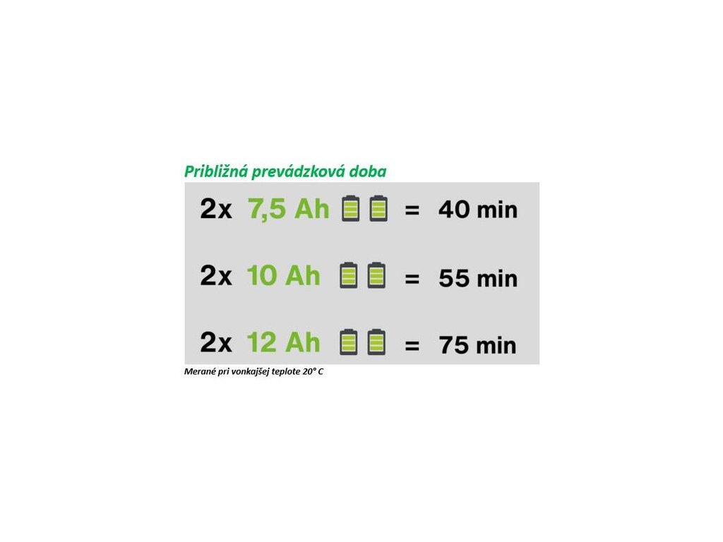 Odporúčané batérie: 2x 7,5 Ah, 2x 10 Ah, 2x 12 Ah.