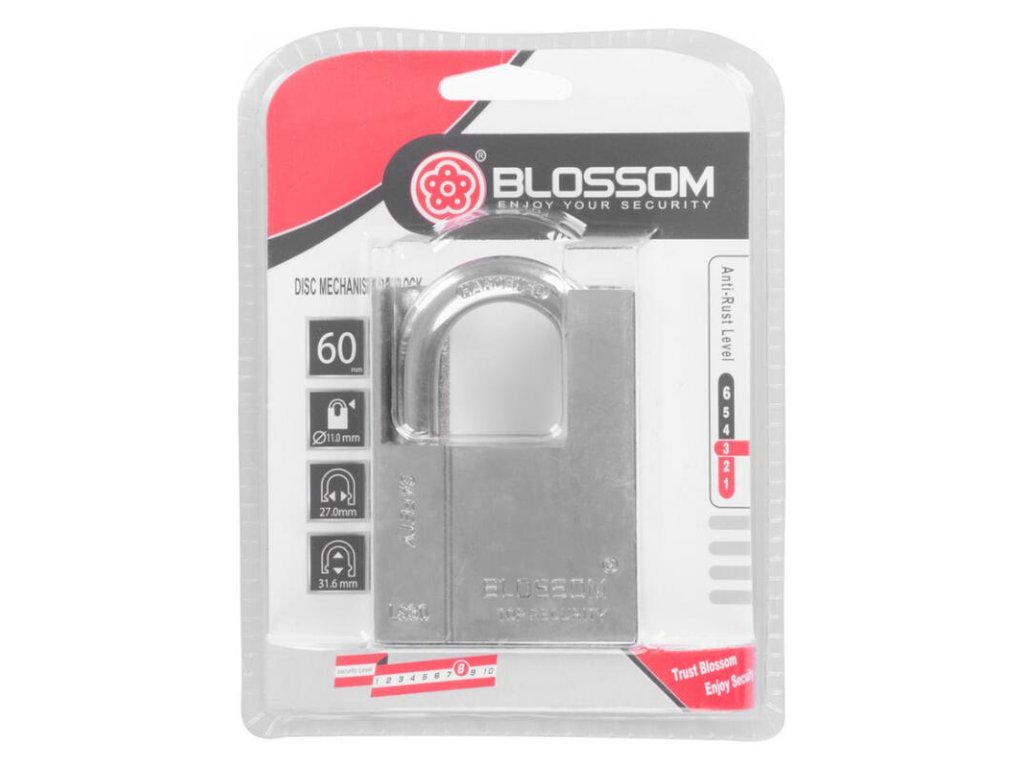 Zámok Blossom je určený na uzamykanie brán, dverí a skríň. Je to visiaci zámok so šírkou 60 mm. Technológia Hi-Sec vam zaručuje požadovanú ochranu uzamknutých objektov.Technické parametre: