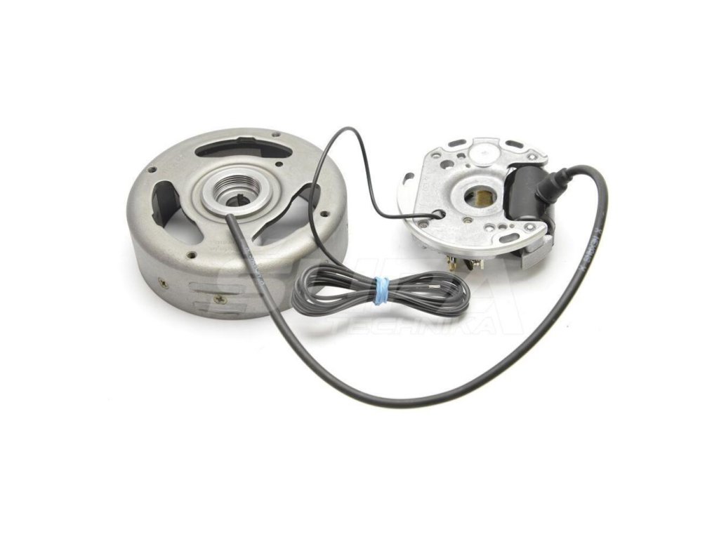 Statorová doska osadená zapaľovacou a svetelnou cievkou. Tento diel generuje energiu pre iskru a osvetlenie prívesu. Pri poruche (napr. medzizávitový skrat) je výmena celého statora najspoľahlivejším riešením.Hlavné vlastnosti: