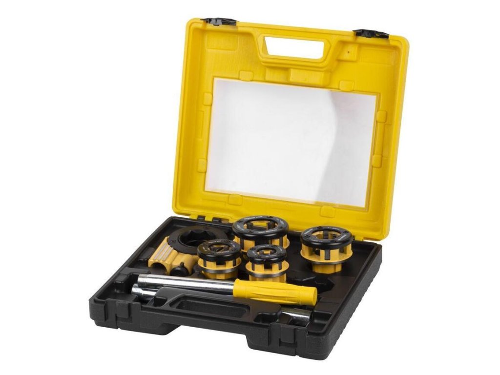 6 Dielna sada závitnic Strend Pro by nemala chýbať vo výbave profesionálnych remeselníkov, ale aj domácich kutilov. Sada je určená na rezanie závitov a obsahuje hlavice (1/2", 3/4", 1", 1-1/4"), rukoväť, nadstavec na rukoväť a račňovú hlavu.