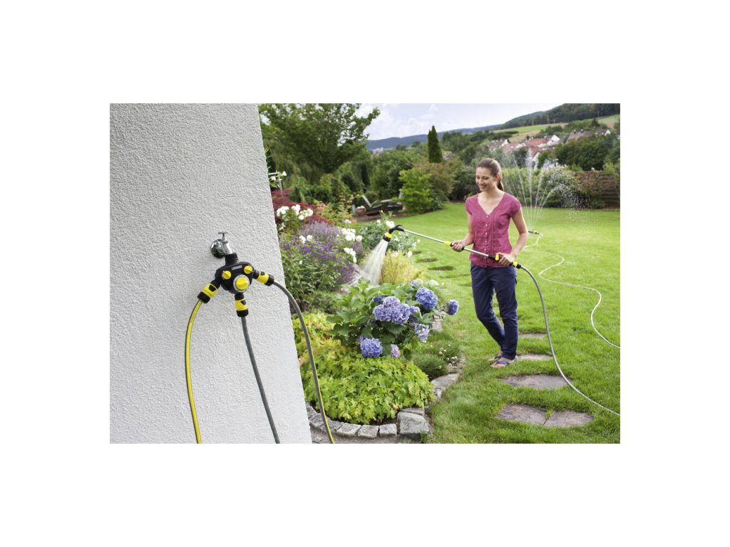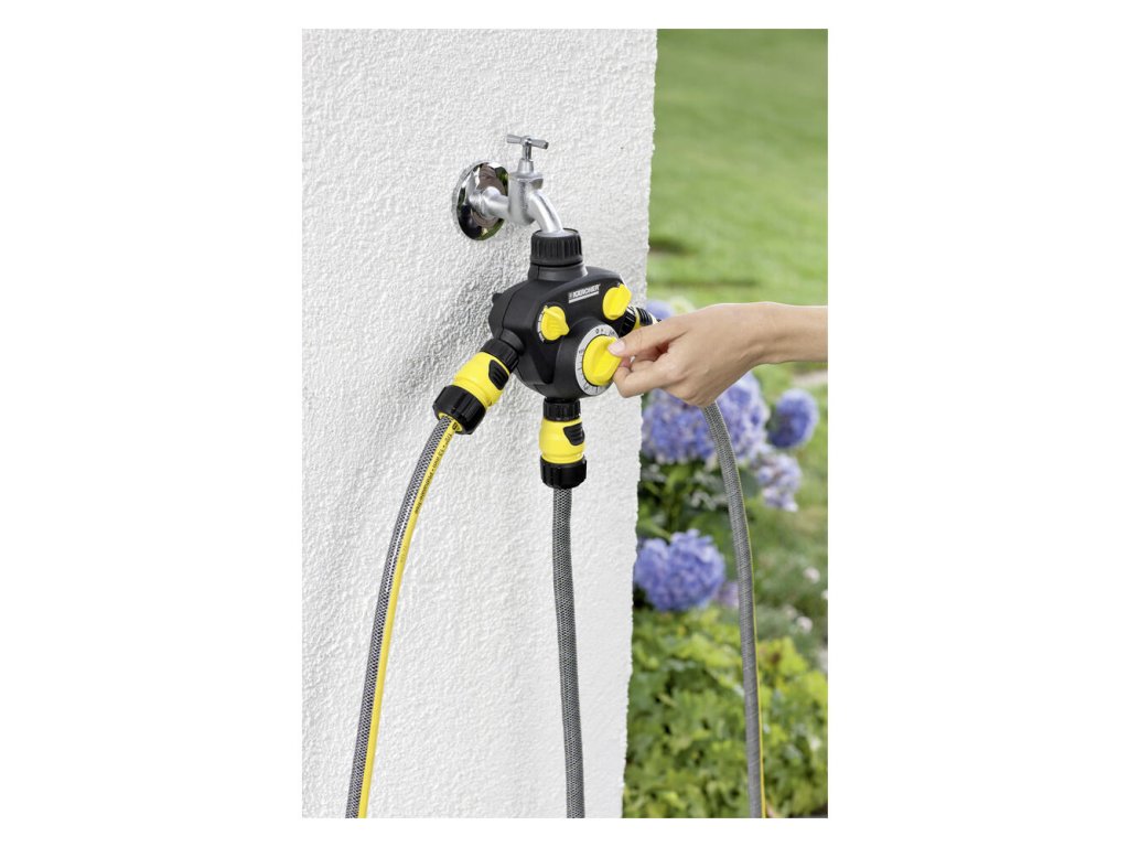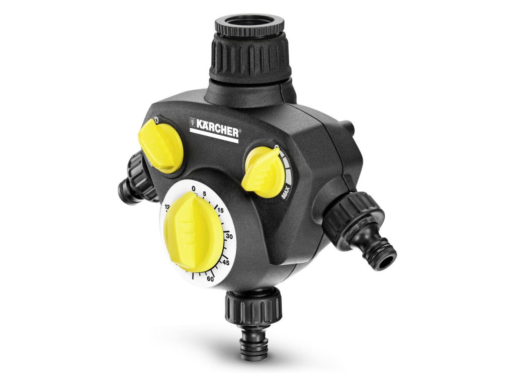 WT 2 je 3-cestný rozvádzač a zavlažovacie hodiny v jednom. Obsahuje dve prípojky na vodovodný kohútik s dvomi nezávislými, bezstupňovými regulátormi a vyznačuje sa optimalizovaným prietokom vody. V 3. prípojke na vodovodný kohútik sú integrované zavlažovacie hodiny. Čas zavlažovanie je možné nastaviť bezstupňovo až na 120 minút. Zavlažovanie sa po uplynutí nastaveného času automaticky zastaví. WT 2 s prípojkou na vodovodný kohútik a redukciou G3/4 sa dá použiť univerzálne v spojení s všetkými bežnými záhradnými hadicami a láka svojou robustnou kvalitou a ergonomickým dizajnom pre príjemnú manipuláciu. Prevlečná matica s ľahkým chodom a pevným vnútorným závitom zaručuje jednoduché upevnenie na vodovodný kohútik. Kompatibilná so takmer všetkými dostupnými klik-systémami.